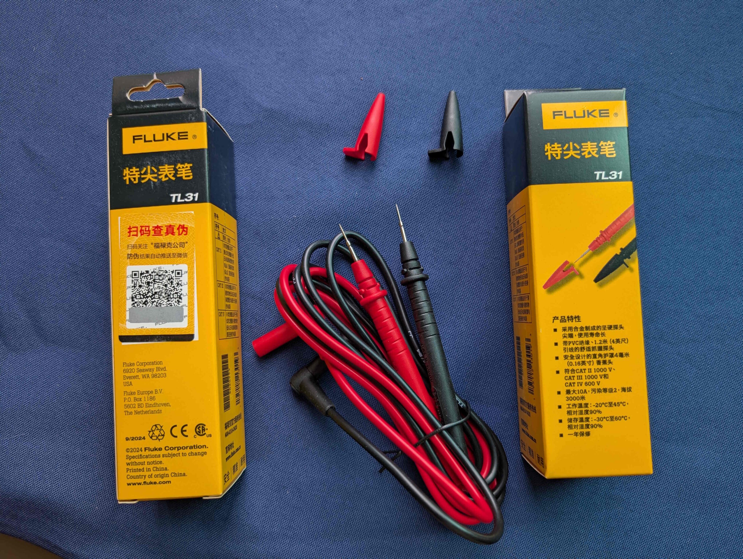 - 兼容於Fluke和其他的萬用電表接受安全籠罩,標準直徑香蕉連接器。